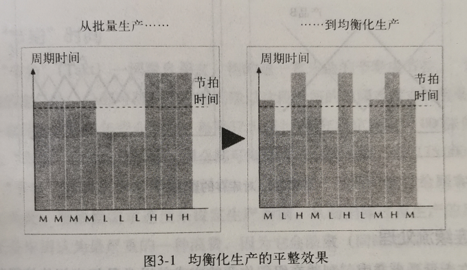 在理想狀況下,豐田會確實依照接到訂單的順序來生產車輛。但實際上,由于工作內容不同,也就是制造不同產品所需要的總時間不同,因此無法像在理想狀況下那樣行事,必須通過均衡化生產來協調。通過均衡化生產,生產期間的真正需求可以被人為地均衡化,進而創造出穩定的“拉動”速度與產品組合。