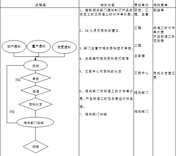5.8經總經理核準后標準工時計件單價表,由文控中心分發(fā)給財務部、生產部、物控及工程部各一份.