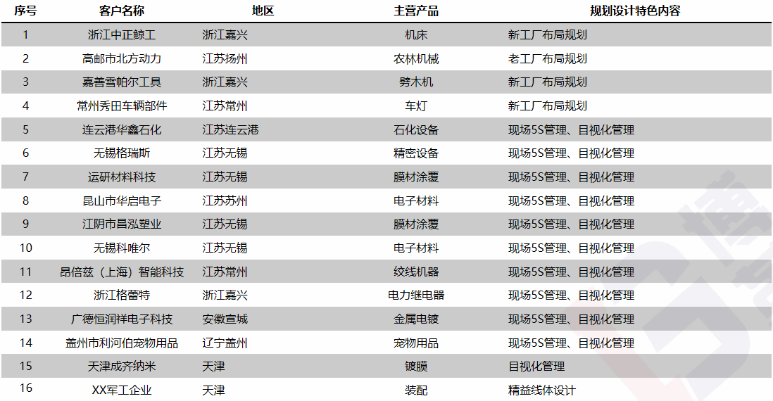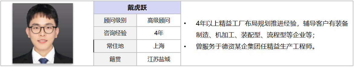 擅長(zhǎng)業(yè)務(wù):新工廠布局規(guī)劃、精益布局與物流改善、整體倉(cāng)儲(chǔ)規(guī)劃、IE改善手法、單元化生產(chǎn)與線平衡分析、精益生產(chǎn)成本降低、精益生產(chǎn)配送管理、精益物流-成套供應(yīng)物料模式、標(biāo)準(zhǔn)工時(shí)開發(fā)、現(xiàn)場(chǎng)6S改善、目視化提升、工廠園區(qū)目視化整體優(yōu)化;