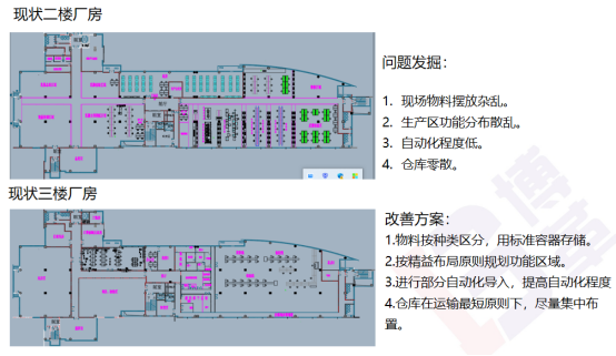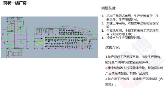 根據(jù)現(xiàn)狀調(diào)查和分析,博革咨詢認為,先合理規(guī)劃各樓層功能,再打造連續(xù)流的生產(chǎn)方式,降低成本金額,核心工作是要縮短生產(chǎn)周期、降低中間WIP,提高生產(chǎn)效率,改善現(xiàn)場環(huán)境。