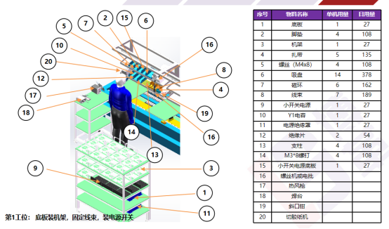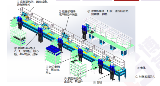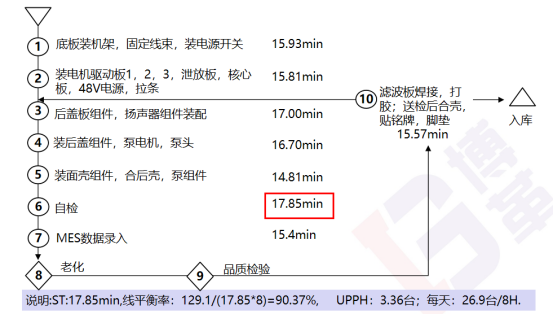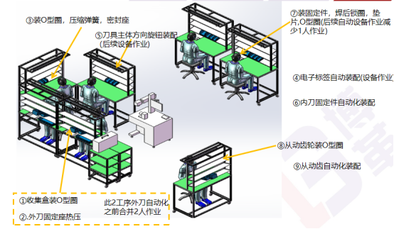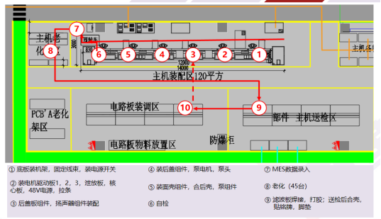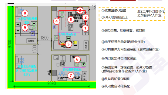 通過連續(xù)流布局,配配用設備嵌入生產(chǎn)線,減少生產(chǎn)斷點與搬運,斷點由12降到3個,生產(chǎn)過程搬運距離由860米降到60m