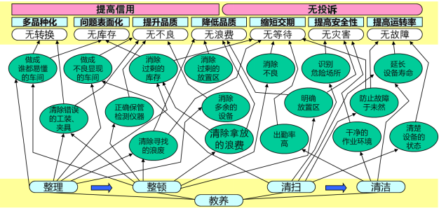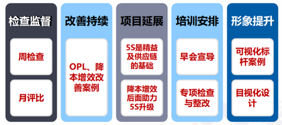 改善持續性的保證、領導表率、逐漸有序培訓、全員參與、自動自發、讓5S變成企業的一種基本素質、基本工具、精益管理的基本功.