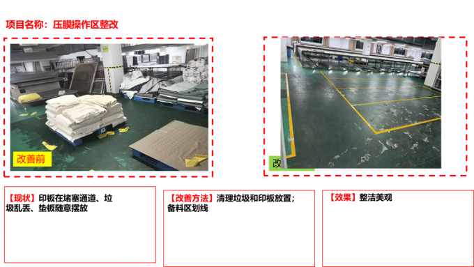 隨后,對所有物品實施“三定”管理:定置(確定存放位置)、定容(明確容器和容量)、定標示(標識清晰易辨)。通過系統(tǒng)整頓,不僅優(yōu)化了工作流程,還大幅提高了物料和工具的取用效率。全員積極參與改善活動,累計完成現(xiàn)場改善500項,包括工具擺放合理化、通道暢通化、區(qū)域功能明確化等,為后續(xù)6S深化打下了堅實基礎。