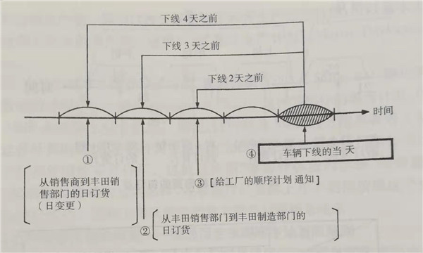 步驟4 從銷售部門收到日訂貨的制造部門,立即編制針對混流裝配線的順序計劃,這個順序計劃的通知時間,在成品車下線僅僅兩天之前。在此,看望再次注意每天編制并道知順序計劃。以上從步驟2到步驟4的訂貨鏈流程圖解是圖3。