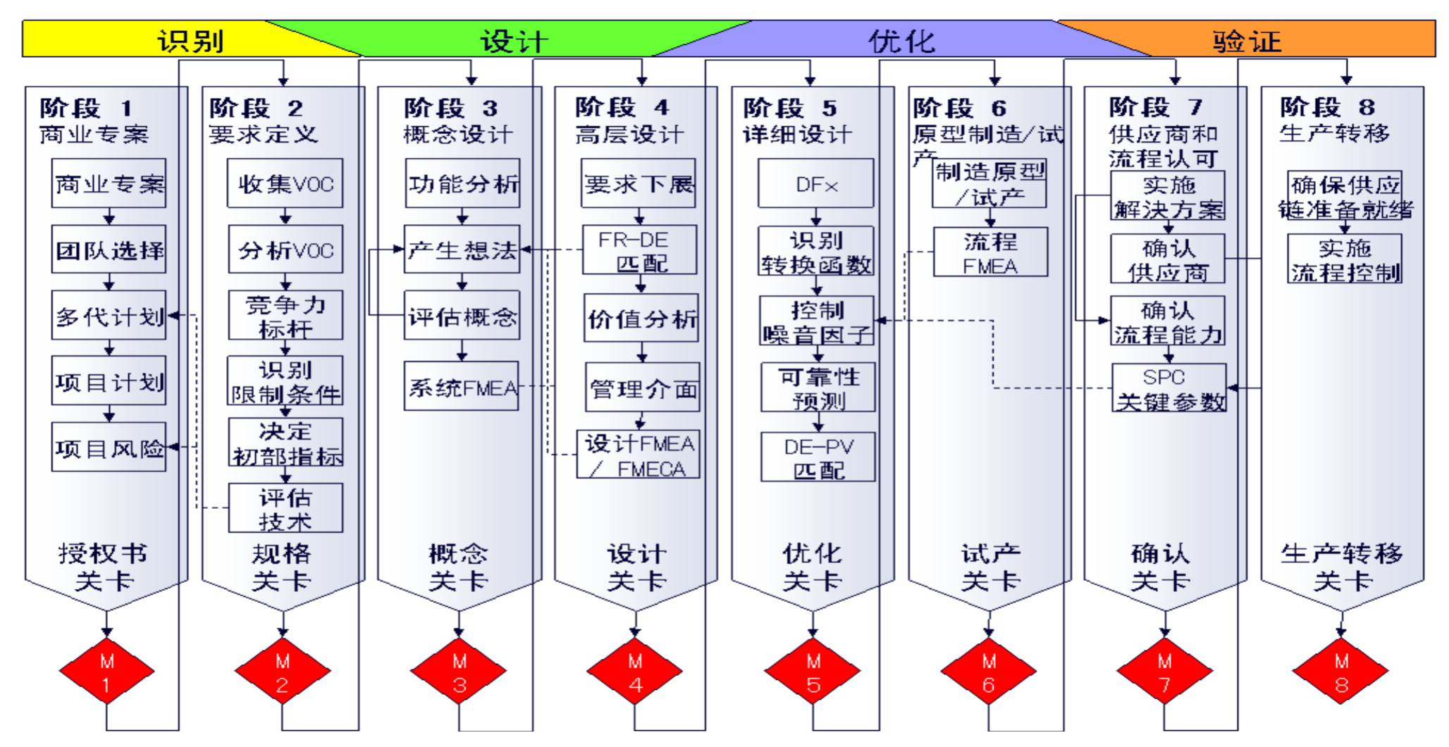 一般設計流程的階段和行為均可以與IDOV或DMADV方法論相對應: