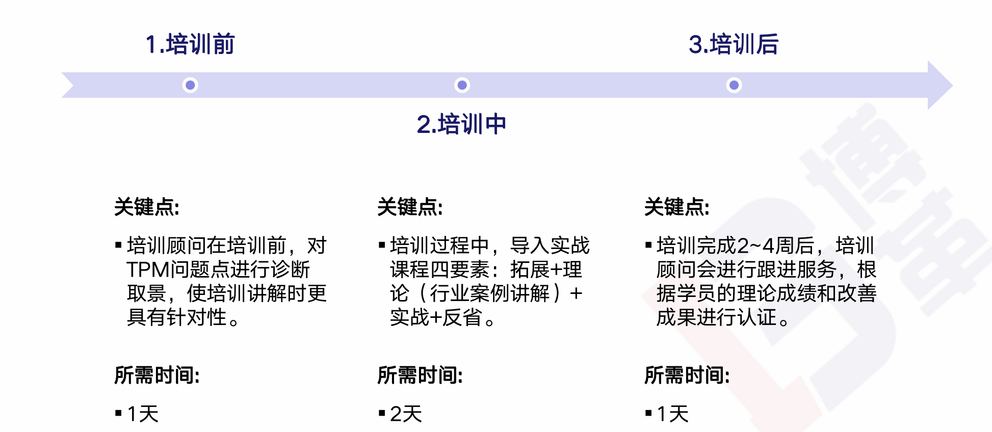精益TPM實(shí)戰(zhàn)培訓(xùn)是以全員生產(chǎn)性維護(hù)TPM管理為主題的精益實(shí)戰(zhàn)培訓(xùn)。該培訓(xùn)分為三個(gè)階段,通過【診斷取景+行業(yè)案例講解+現(xiàn)場(chǎng)實(shí)戰(zhàn)+培訓(xùn)后跟蹤服務(wù)+認(rèn)證】的實(shí)戰(zhàn)培訓(xùn)模式,使學(xué)員能系統(tǒng)地學(xué)習(xí)TPM的理論知識(shí),并迅速地應(yīng)用在實(shí)際工作中,使其對(duì)TPM管理 工作產(chǎn)生認(rèn)同感。
